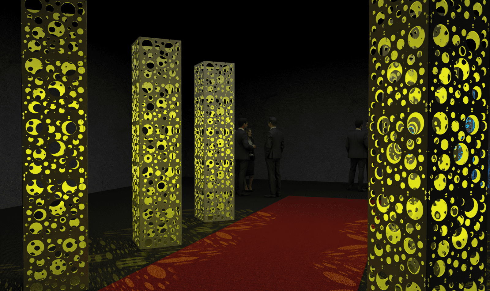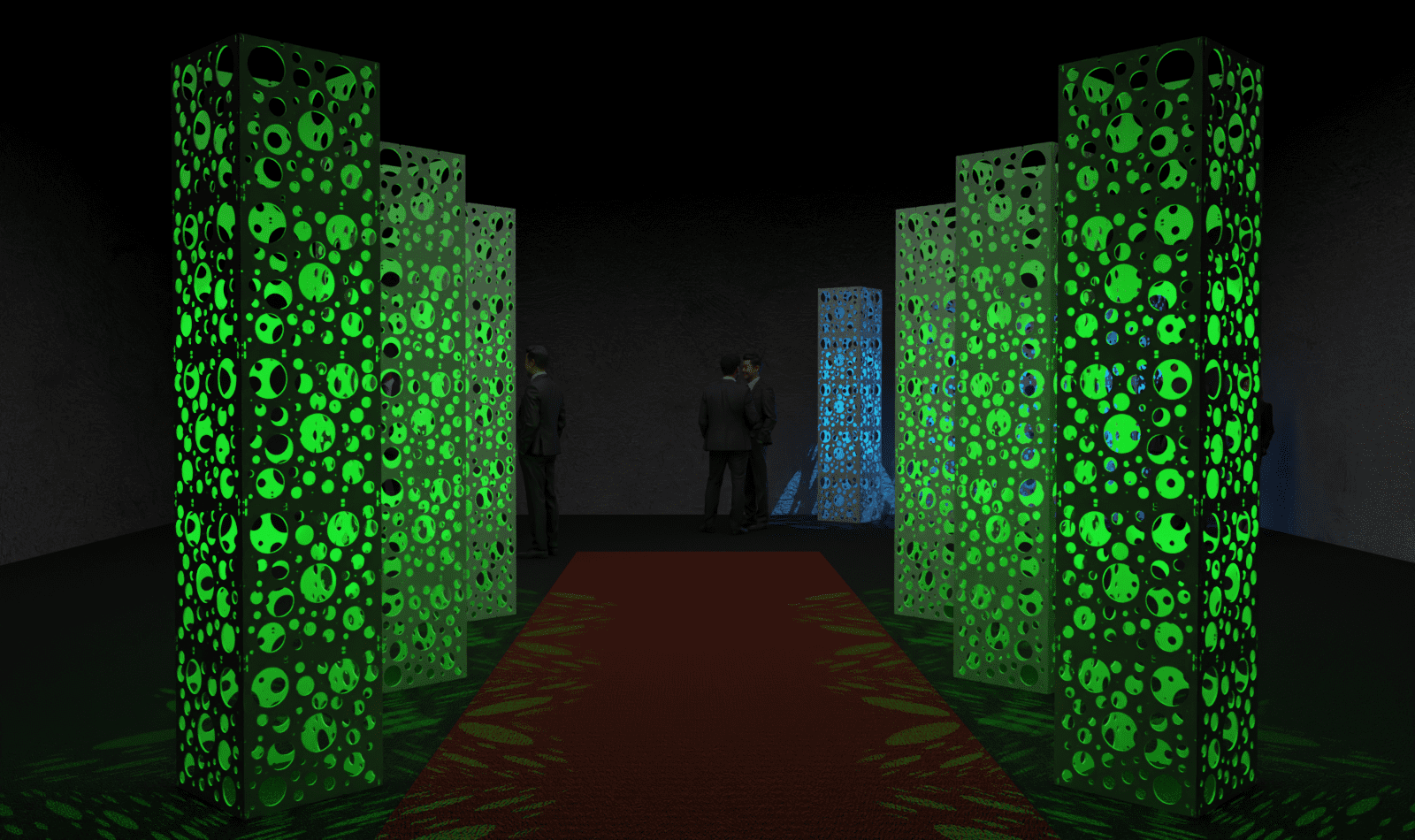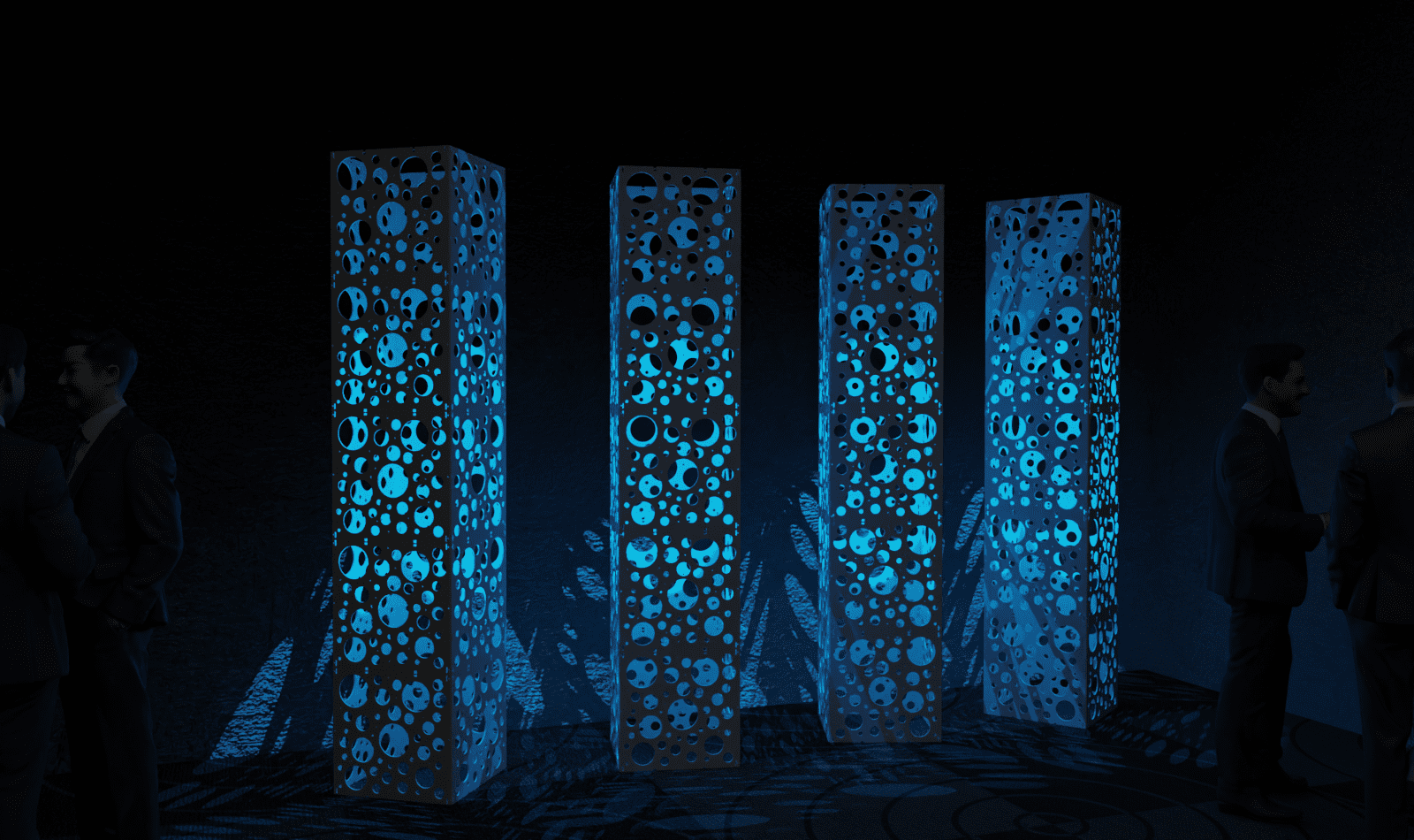 Urban Bubbles – Contemporary Illuminated Event Décor Create a striking modern atmosphere with Urban Bubbles, a bold event décor theme defined by flowing circular patterns and glowing illuminated structures. Inspired by organic forms and modern architectural design, Urban Bubbles brings a sense of movement and depth to any venue while maintaining a clean, contemporary aesthetic. At the heart of the theme are the Urban Bubbles Columns, tall illuminated towers featuring layered circular cut-outs that cast intricate patterns of light across surrounding walls and floors. When placed throughout a venue, the columns create a dynamic visual rhythm that transforms empty spaces into immersive environments. The theme can be extended with matching table centres, illuminated features, and modular elements, allowing event designers to build a cohesive look across entrances, stages, lounges, and dining areas. The glowing bubble patterns produce a soft yet dramatic lighting effect that works equally well for corporate events, brand launches, gala dinners, and modern parties. With programmable LED lighting, Urban Bubbles can shift effortlessly between cool corporate tones, vibrant colour palettes, or elegant monochrome lighting to suit the mood of your event. Bring fluid design and modern illumination together with Urban Bubbles – a contemporary event theme that turns light and pattern into a captivating experience.