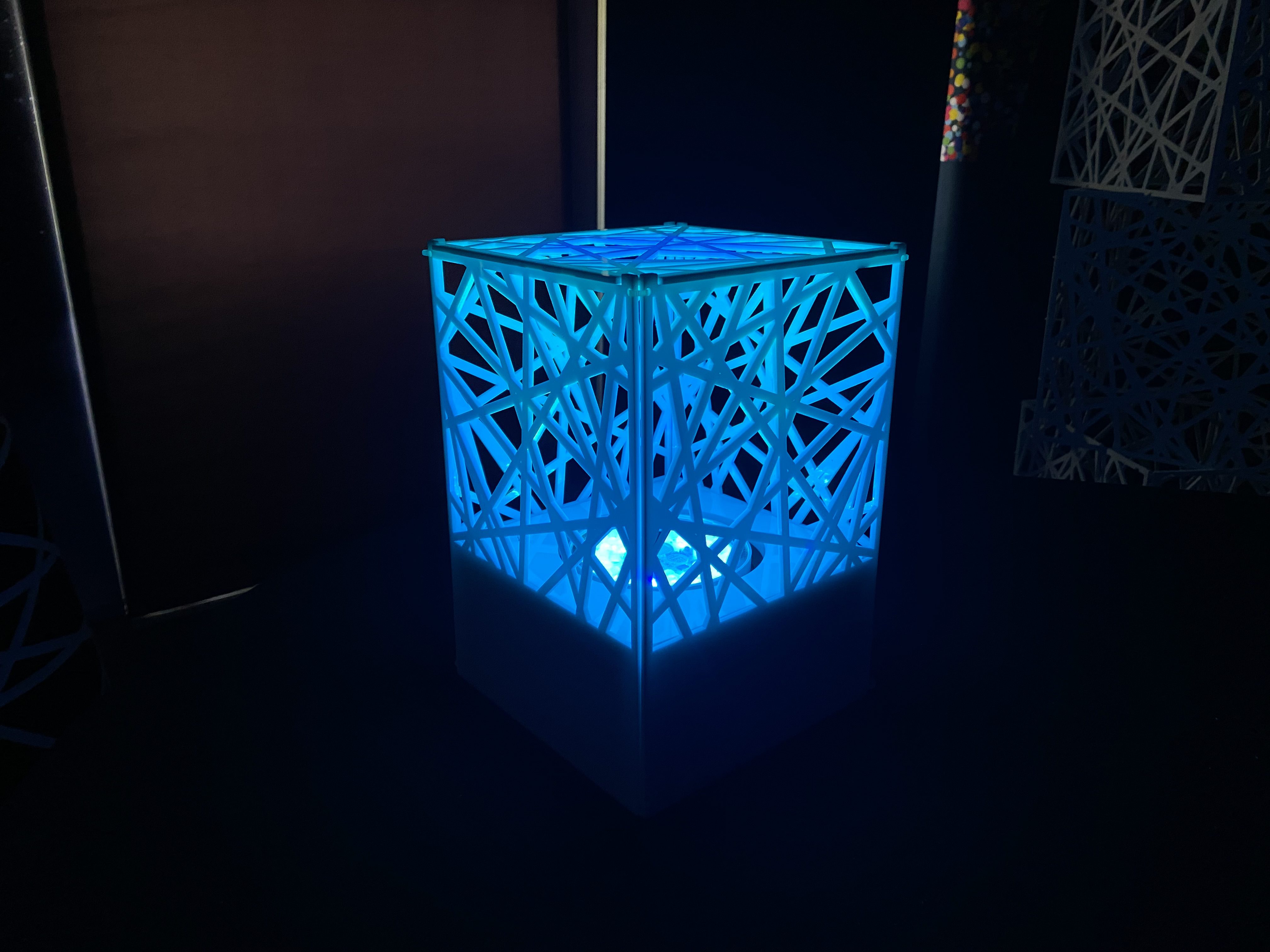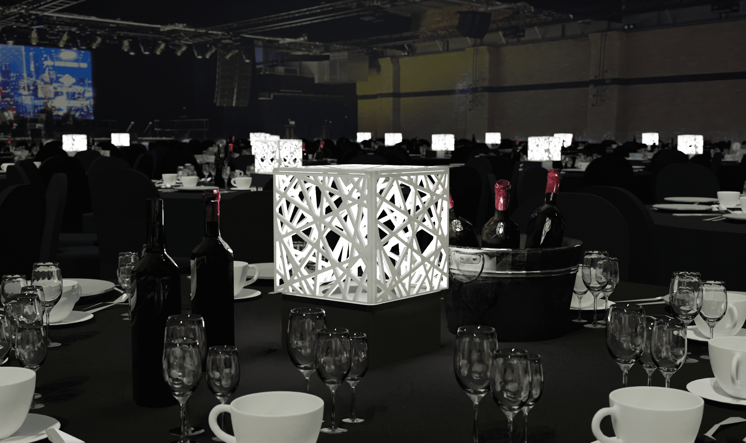 Urban Mesh Table Centres – Modern Geometric Design Bring the Urban Mesh look to the tabletop with these striking illuminated table centres. Each piece is a compact 18 cm mesh block, designed with the same geometric laser-cut pattern and vibrant LED lighting as our full-size Urban Mesh Columns. These modern centrepieces are ideal for adding a touch of sophistication and style to dining tables, cocktail areas, or coffee tables. Small in size but big in impact, they create a glowing focal point that ties the room together and reinforces your event’s theme. The versatility of the modular design means the table centres can stand alone as elegant features or be paired with other Urban Mesh décor for a seamless, cohesive look. With programmable LED colours, they can be matched to your brand, event theme, or mood – from sleek corporate tones to bold party vibes. Make every table part of the experience with Urban Mesh Table Centres – compact, creative, and unforgettable décor.